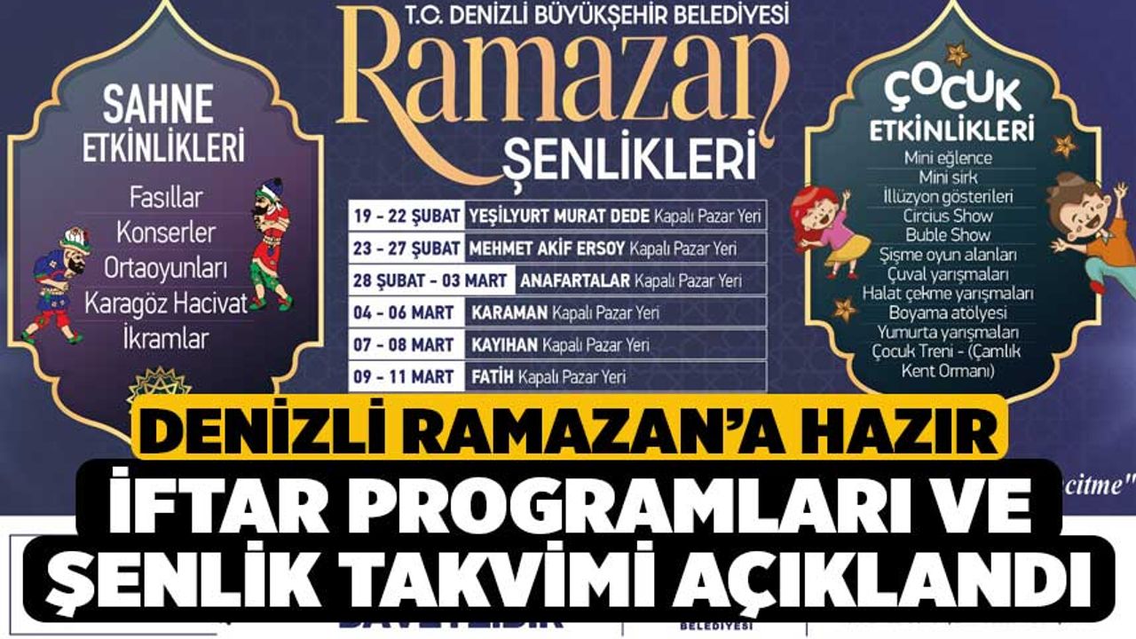 İftar programlarının yanı sıra kentin farklı noktalarında Ramazan şenlikleri düzenlenecek. Yeşilyurt-Muratdede, Mehmet Akif Ersoy, Anafartalar, Karaman, Kayıhan ve Fatih kapalı pazaryerlerinde gerçekleştirilecek etkinliklerde fasıl dinletileri, konserler, ortaoyunları, Karagöz-Hacivat gösterileri ve çeşitli ikramlar Denizlililerle buluşacak. Etkinlikler belirlenen takvim çerçevesinde 17.00-19.00 ile 21.00-23.00 saatleri arasında düzenlenecek.
