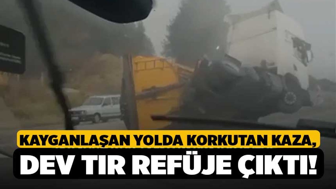 Yağışın etkisiyle kayganlaşan zeminde sürücüsünün direksiyon hâkimiyetini kaybettiği dev araç, yolda savrulmaya başladı. Metrelerce kayan tır, yol ortasındaki refüje çıkarak ancak durabildi. Kazada şans eseri ölen ya da yaralanan olmazken, tırda maddi hasar meydana geldi.